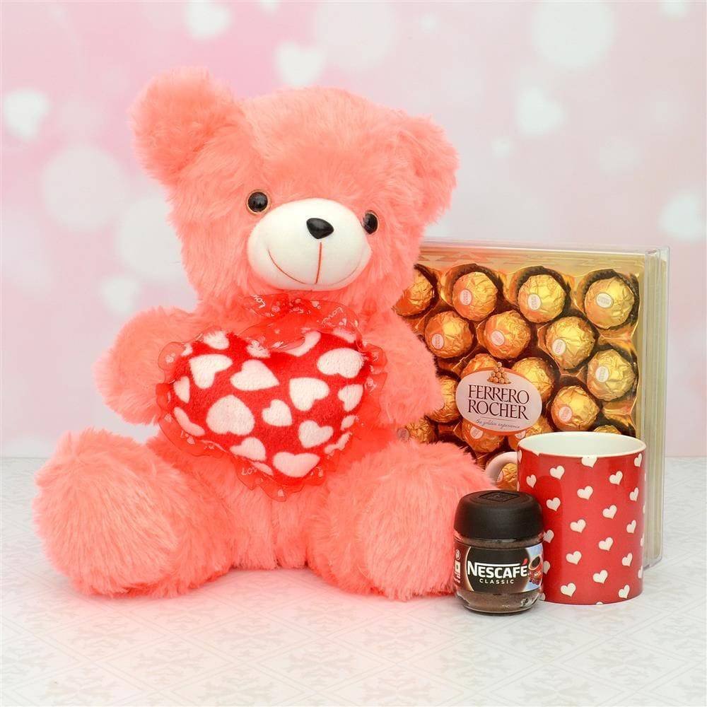 Peach Color Teddy Holding Love Heart – 13 Inch Fererro Rocher – 24 Pcs Red Love Sign Mug Nescafe Coffee (25g)